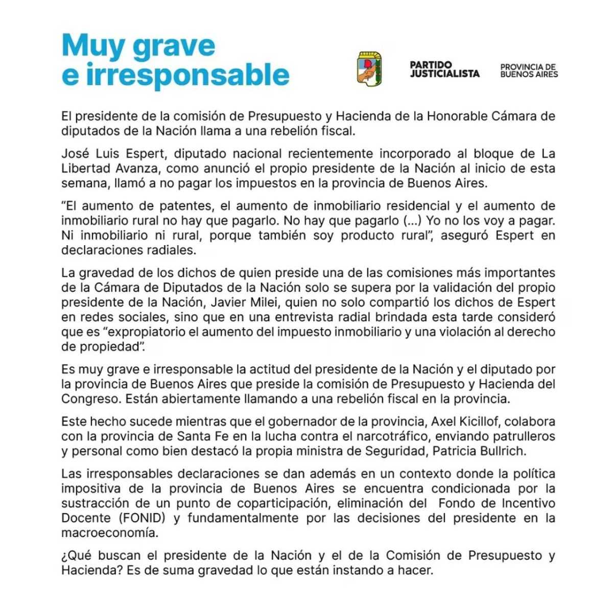 Tras realizar dichas declaraciones, Espert escribió en su cuenta oficial de la red social X que “no hay que pagarle ningún aumento de impuestos a Kicillof (hizo explotar patentes, inmobiliario residencial y rural) porque no nos da nada a cambio a los bonaerenses. Y la única manera de protestar que tiene el contribuyente frente al robo impositivo es no pagar”.